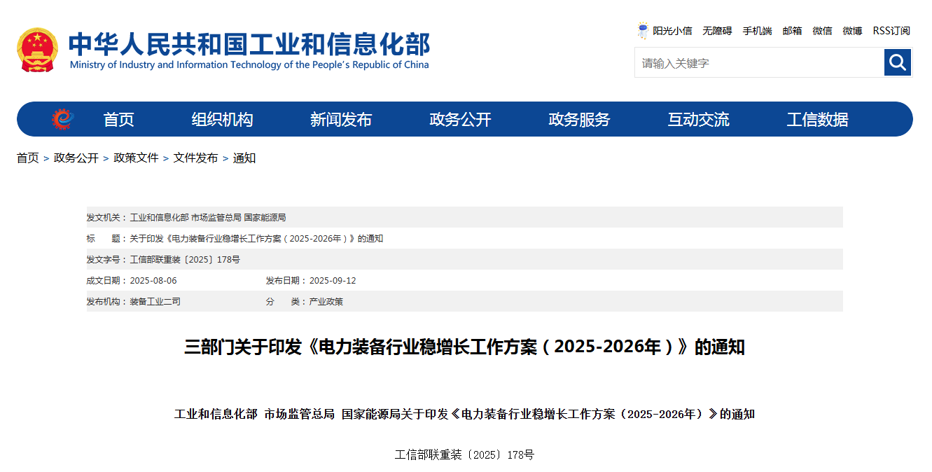 近日,工业和信息化部、市场监管总局、国家能源局联合发布关于印发《电力装备行业稳定增长工作方案(2025-2026年)》(以下简称《方案》)的通知。