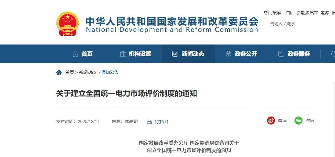 12月17日,国家发展改革、国家能源局发布《关于建立全国统一电力市场评价制度的通知》,围绕加快构建新型电力系统的总体目标,构建科学、系统、动态的电力市场评价体系,统筹安全保供、绿色转型、经济效率等多重目标,全面准确评价电力市场运行成效,为电力市场建设和监管提供决策依据,促进监管工作科学化、精准化,进一步发挥全国统一电力市场在电力资源优化配置中的决定性作用。