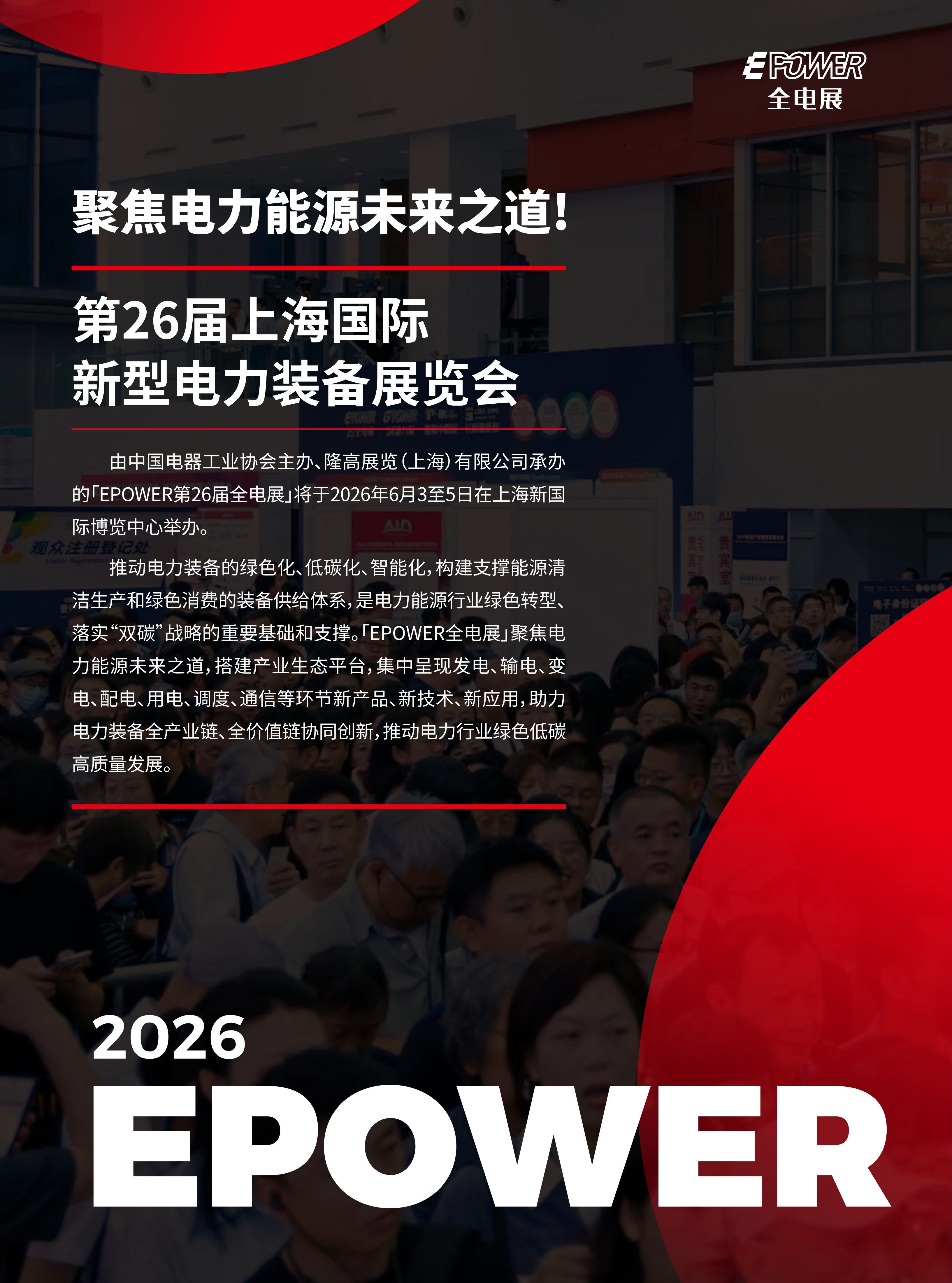 为推动电力装备的绿色化、低碳化、智能化,构建支撑能源清洁生产和绿色消费的装备供给体系,实现电力能源行业绿色转型、落实"双碳"战略,由中国电器工业协会主办、隆高展览(上海)有限公司承办的第26届EPOWER全电展将于2026年6月3-5日在上海新国际博览中心举办。